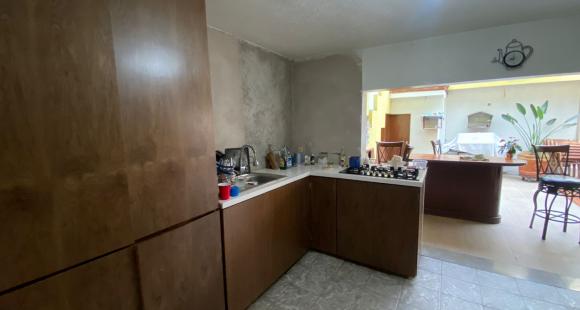 cocina equipada con estufa eléctrica y mobiliario de madera nogal obscuro, terraza en planta baja techada con cristal templado, escalera de madera con cristal curvo.